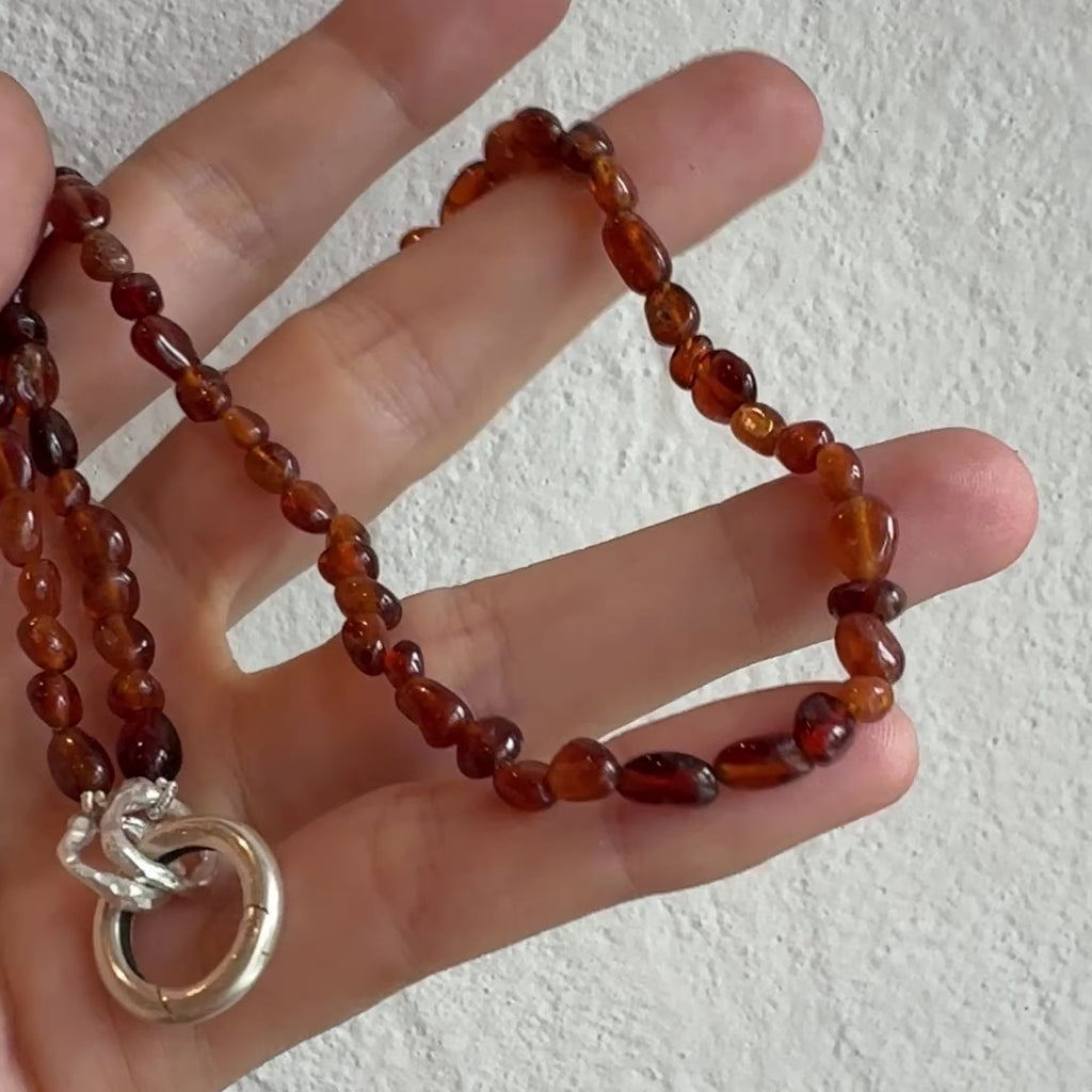 Questa collana è un filo di granati arancioni, la chiusura è in argento 925 a moschettone.